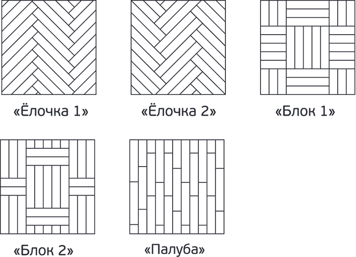 4.12. Укладка «Блоки» Клеевую кварц-виниловую плитку возможно также укладывать блоками. В этом случае важно помнить о кратности размера плашек, плашка B длину равна 5-ти плашкам в ширину. С учетом этого можно создавать различные блоки и их сочетания.