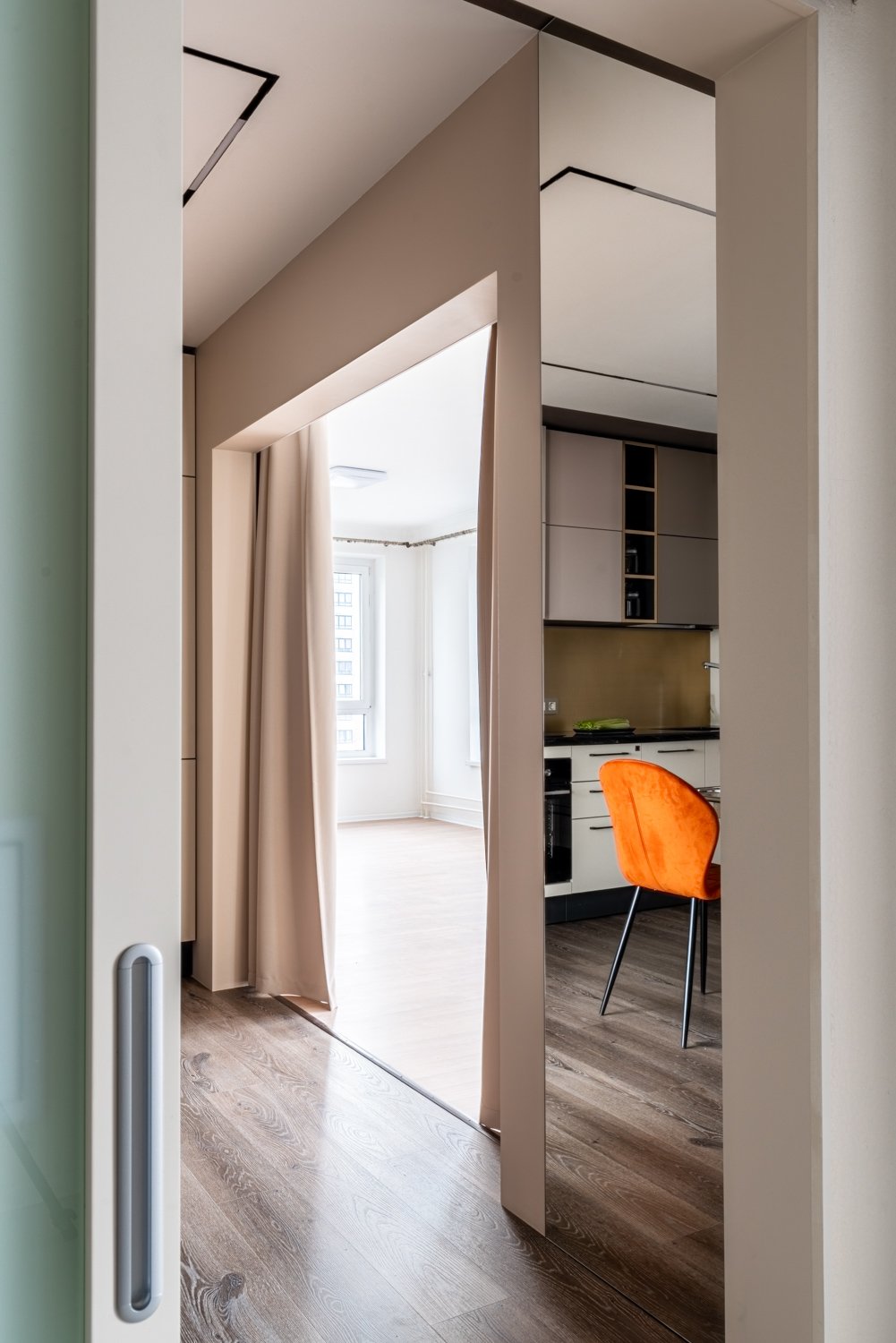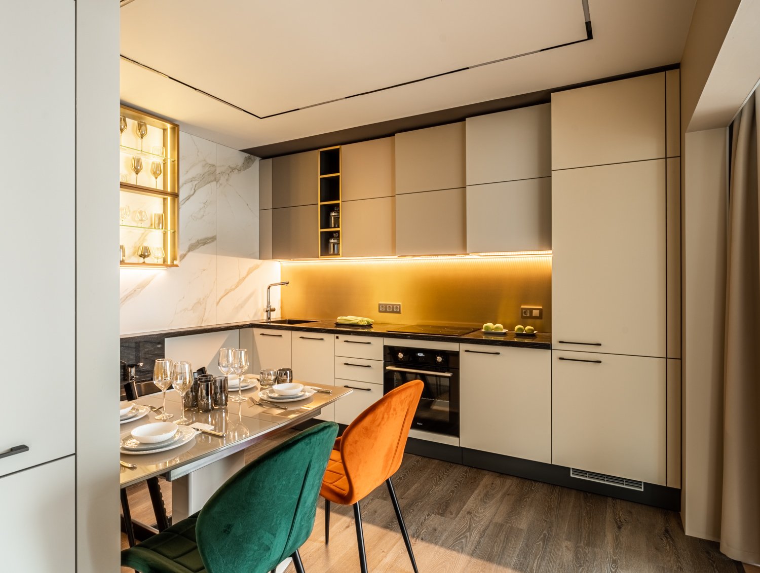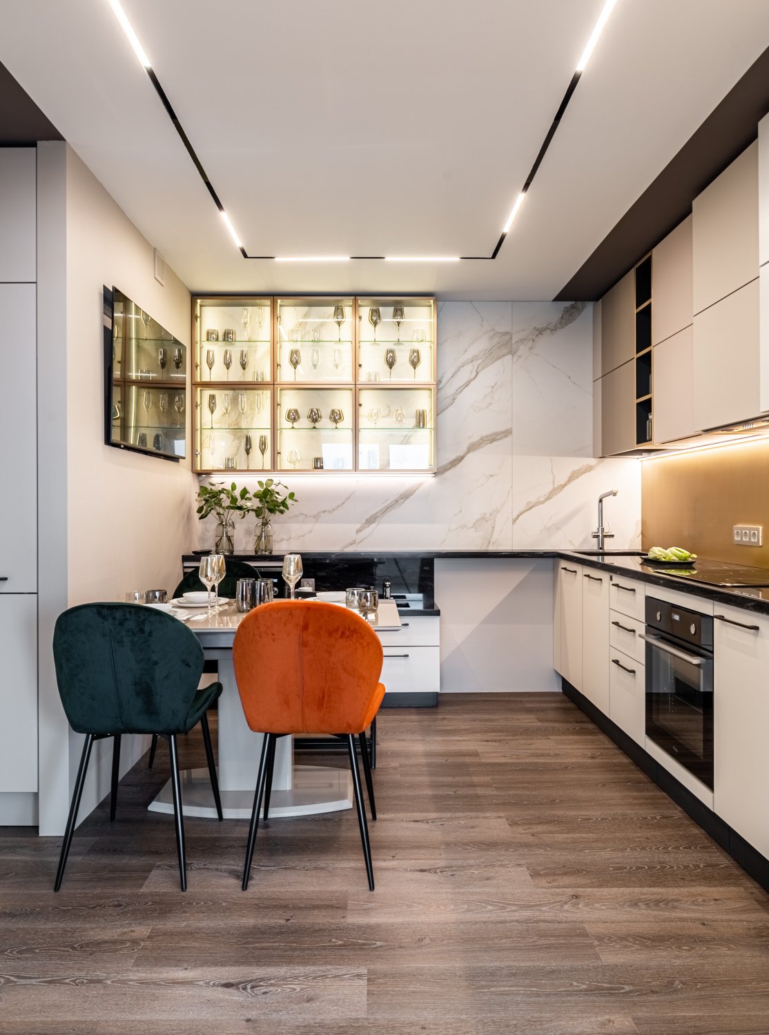 Перед дизайнером Татьяной Кононовой-Левиной стояла задача сделать так, чтобы на кухне было удобно жить, готовить и творить всем жителям квартиры, но и чтобы Данил смог пользоваться удобствами, такими элементарными, как сделать самому себе чай, набрать воды, сделать себе бутерброд. И задача удалась!
